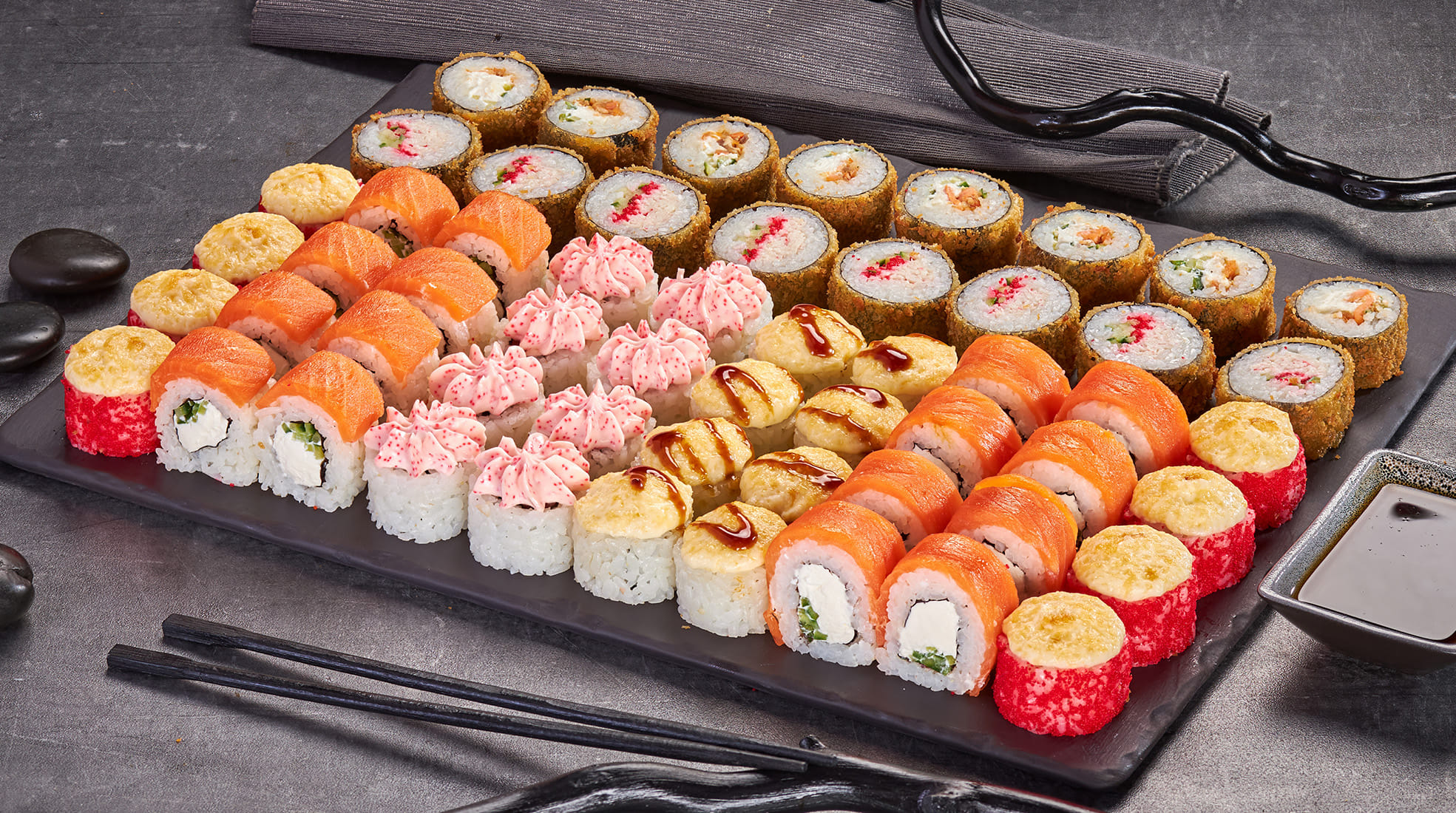 Ролл Филадельфия сяке (8 шт.), ролл Токио запеченный (8 шт.), ролл Филадельфия лайт сяке (8 шт.), ролл Калифорния темпура (8 шт.), ролл Нежный с курицей запеченный (8 шт.), ролл Филадельфия темпура (8 шт.), ролл Лава с крабом (8 шт.) *Внешний вид блюда может отличаться от фото на сайте.